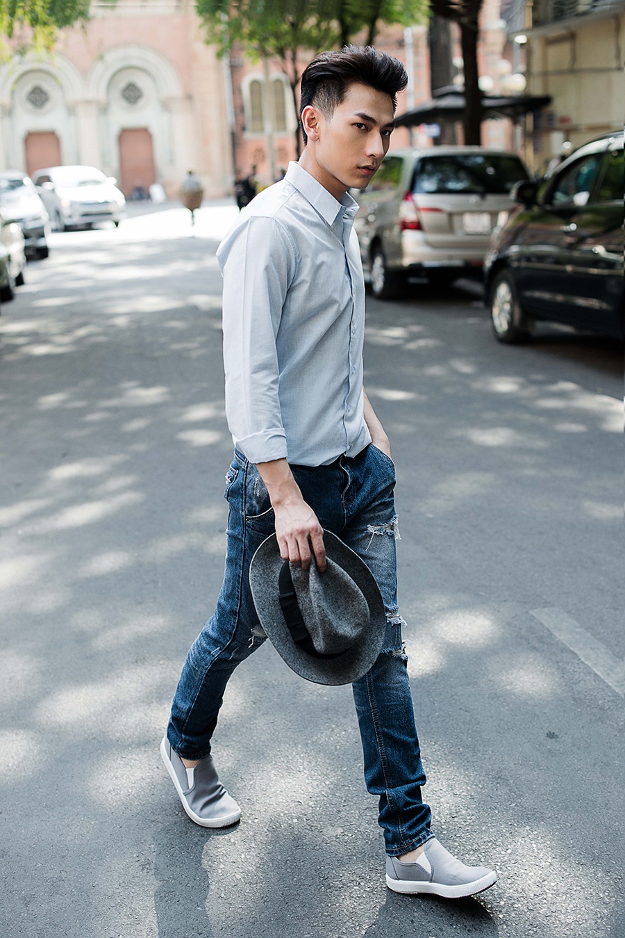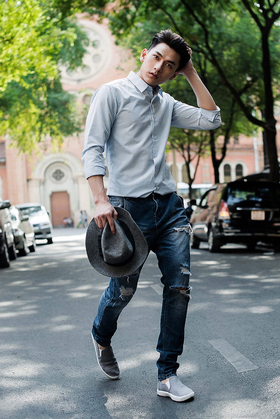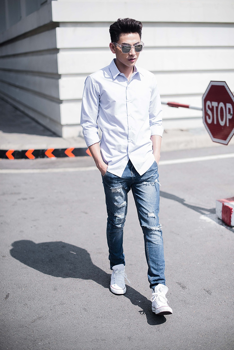 | Thân hình cân đối cùng gương mặt điển trai giúp nam ca sĩ dễ dàng phù hợp trong nhiều set trang phục đường phố. |