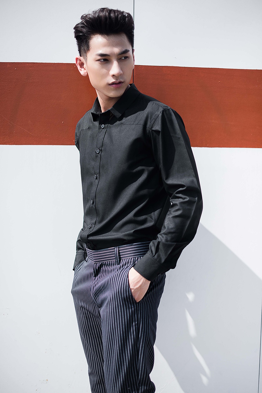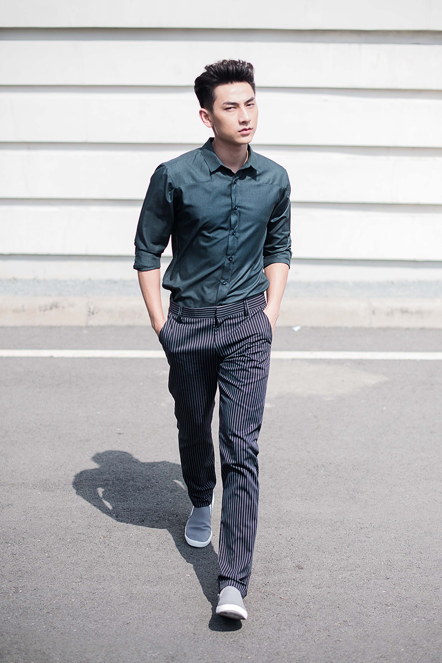 | Quần sọc kẻ mix ăn ý cùng áo sơ-mi tối màu tôn hình tượng nam tính. Isaac cho biết, anh chuộng phong cách lịch lãm, mạnh mẽ nhưng cũng không ngại thử nghiệm những trang phục phá cách, mới lạ để làm mới hình ảnh. Bộ ảnh được thực hiện bởi nhiếp ảnh gia Phan Võ, stylist Huy Khanh, trang điểm Soi và trang phục Urbanista. |