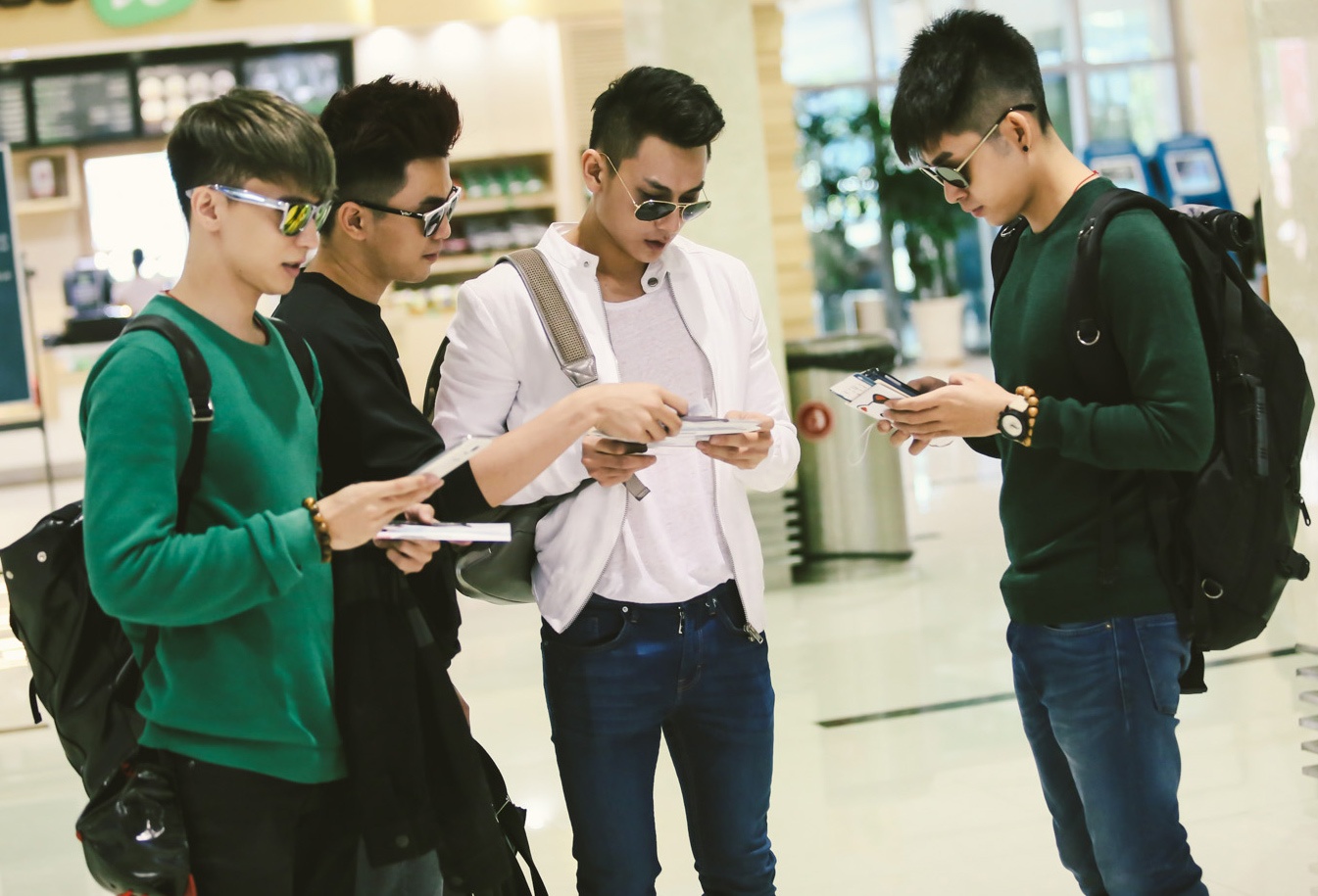 | 4 anh chàng điển trai tranh thủ chụp hình trước khi lên máy bay ra Hà Nội. |