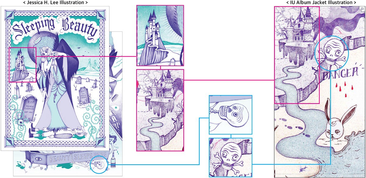 Trong bài viết, nữ nghệ sĩ đã chỉ ra những điểm giống nhau giữa bức vẽ của cô và hình ảnh trên bìa album của IU. Dù không giống nhau 100% nhưng chi tiết, phong cách vẽ và màu sắc của 2 tác phẩm là khá tương đồng.