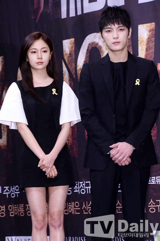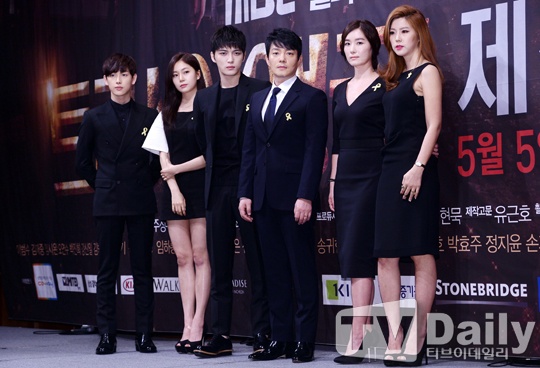 | Tất cả các nghệ sĩ đều đeo dải lụa vàng để tưởng nhớ nạn nhân của vụ chìm tàu Sewol. |