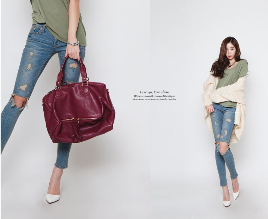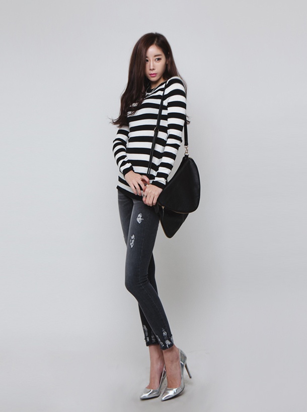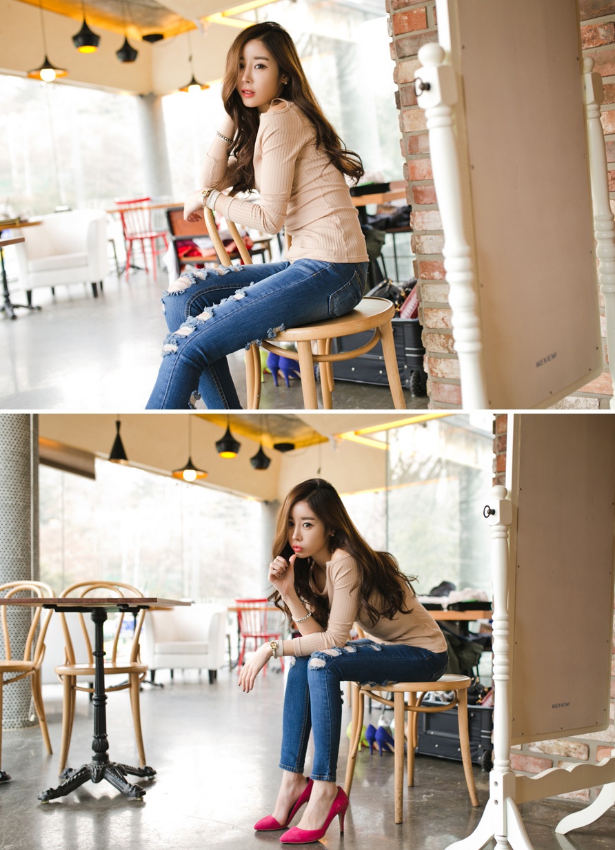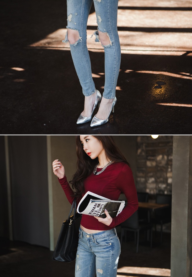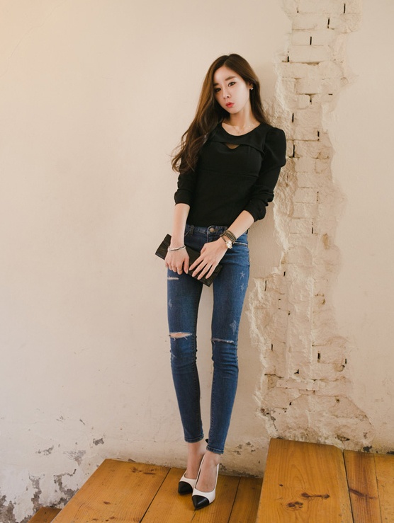 | Jeans rách có kiểu dáng ôm sát mix kèm áo tay phồng cách điệu. |