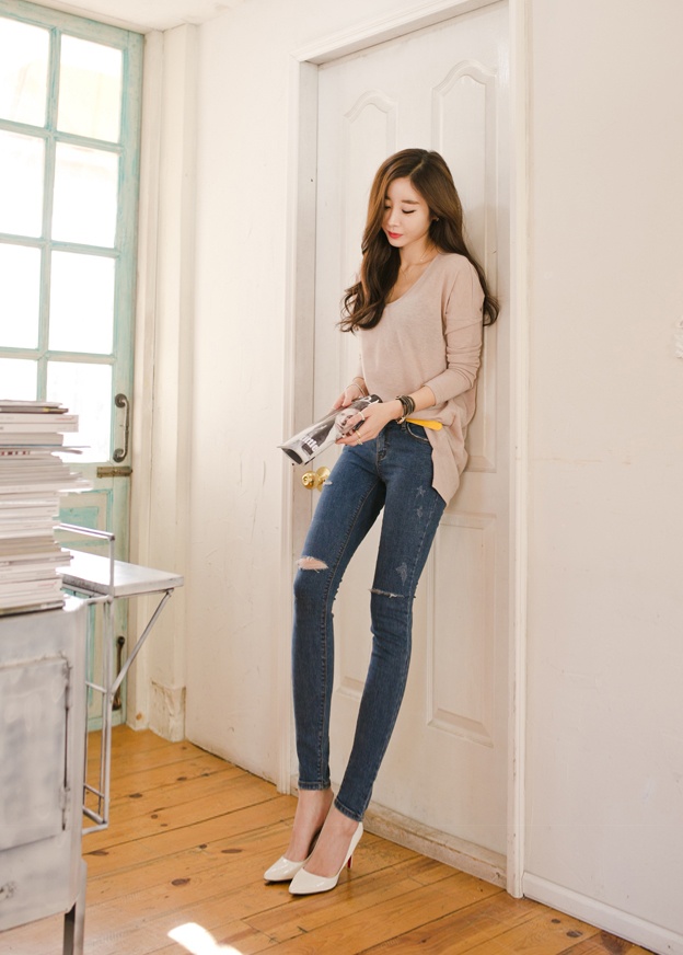 | Quần jeans có độ xé vừa phải mix kèm áo len casmia phù hợp với bạn gái nữ tính. |