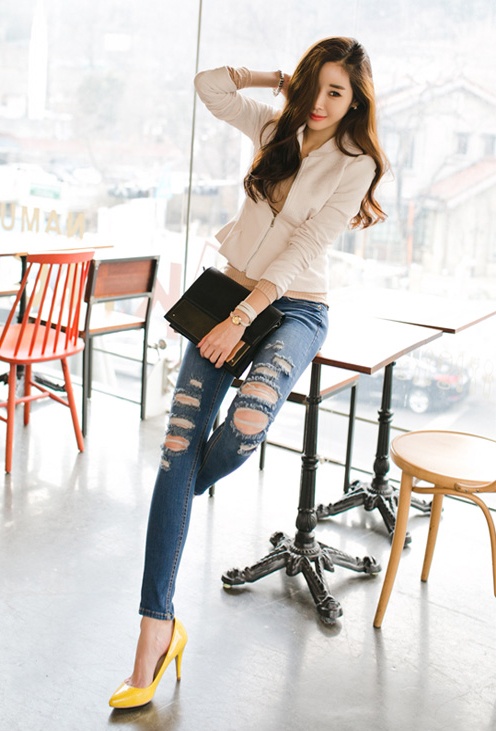 Có lẽ đây là khái niệm còn khá lạ với các tín đồ thời trang, nhưng thực tế, chính kiểu dáng của quần jeans cũng như cách mix đồ sẽ quyết định tất cả. Với các cô gái ưa vẻ thanh lịch thì quần jeans rách sẽ trở nên đáng yêu hơn khi mix kèm các kiểu trang phục công sở ôm sát.
