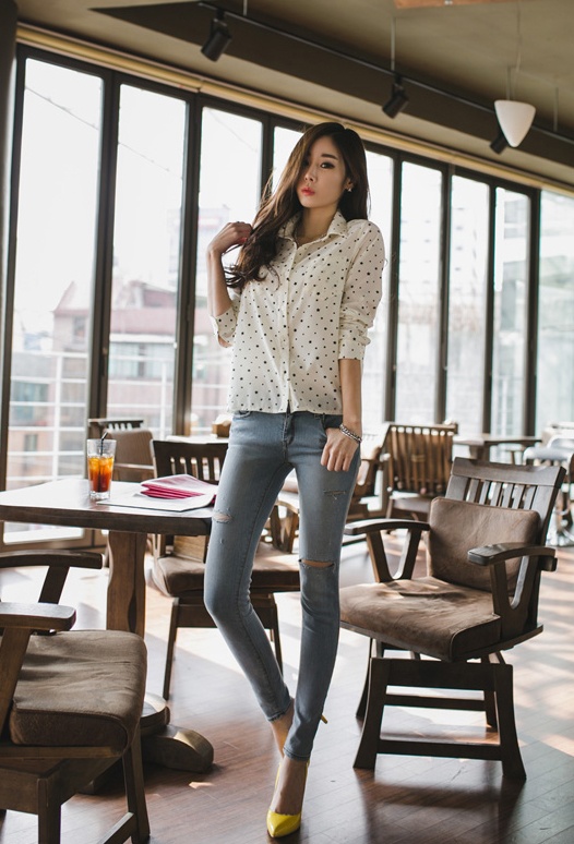 | Phong cách nhẹ nhàng xuống phố với sơ mi chấm bi và quần jeans. |