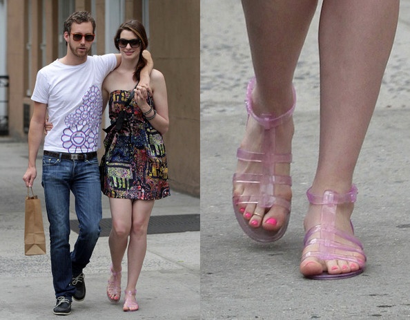 | Jelly sandal không phải chỉ là thứ dành cho "con nhà nghèo". Ngôi sao Hollywood Anne Hathaway cũng từng bị bắt gặp dạo phố với sandal nhựa. |