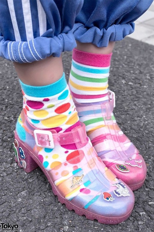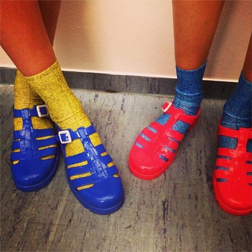 Thay vì dùng trang phục để tạo những mảng sắc màu, bạn có thể tận dụng ngay những đôi giày nhựa sặc sỡ và tất để làm điểm nhấn.