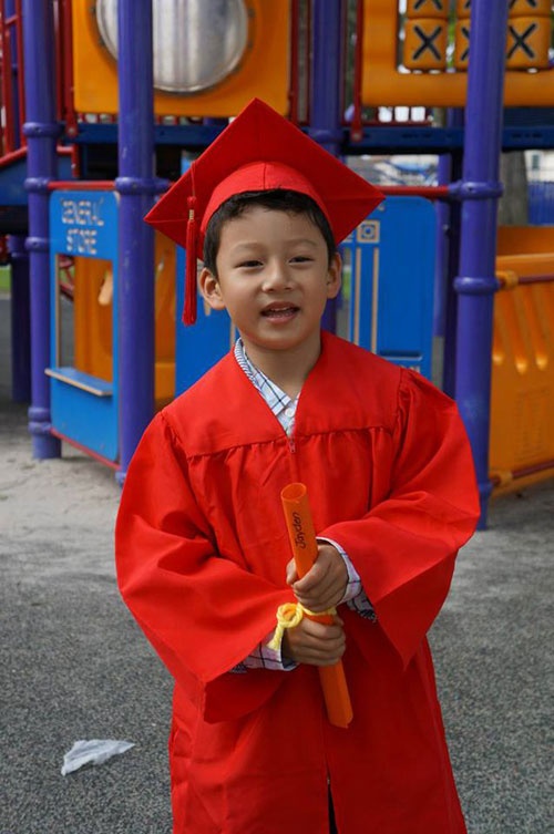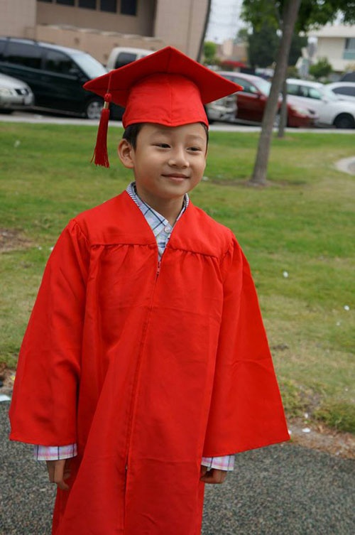 | Không lâu trước khi sinh con gái, Jennifer Phạm khoe ảnh con trai Bảo Nam bảnh bao khi khoác lên mình bộ áo "cử nhân" tốt nghiệp mẫu giáo. |