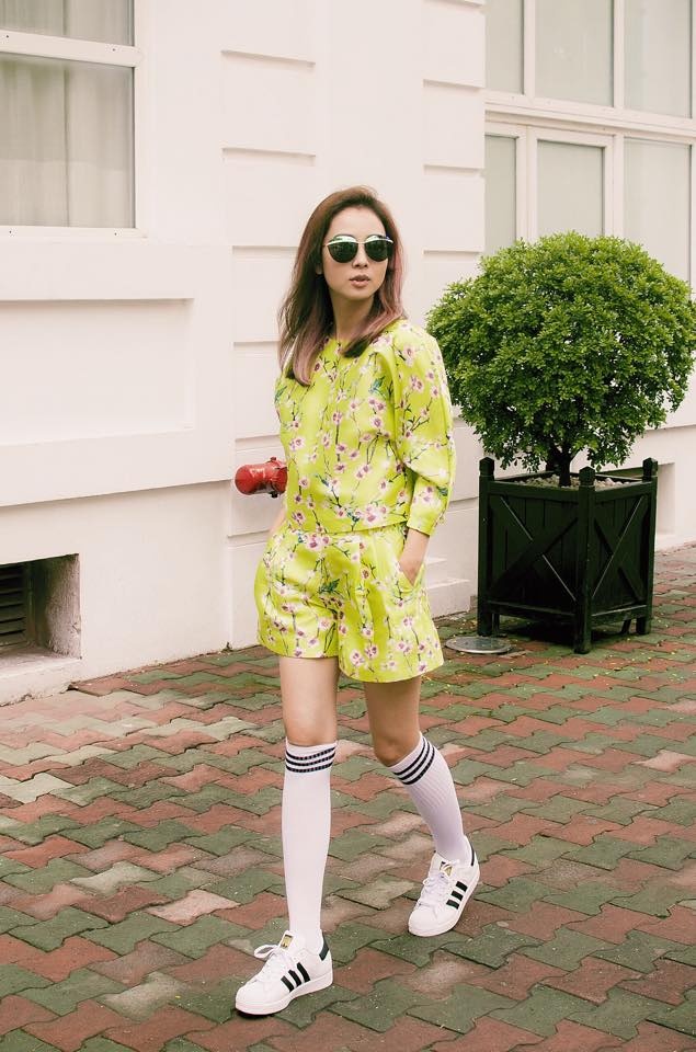 | Cũng với đôi giày này, cô mix kèm cả cây hoa văn rất độc đáo. |