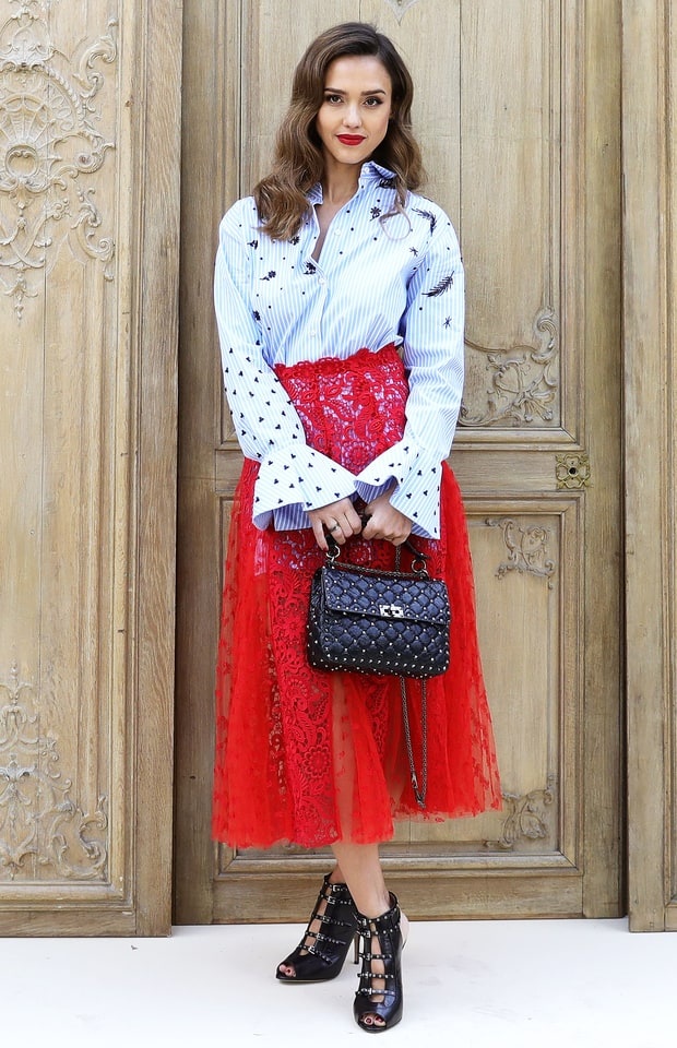| Mới đây, Jessica xuất hiện nổi bật với chân váy ren xuyên thấu màu đỏ phối cùng áo sơ mi tay chuông kẻ sọc và bốt thiết kế ấn tượng tại tuần lễ thời trang Paris. |