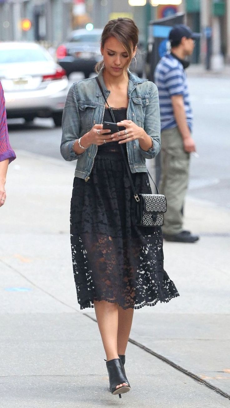 | Đầm xuyên thấu, jean jacket và ankle bốt là cách mix đồ đặc trưng của cô. |