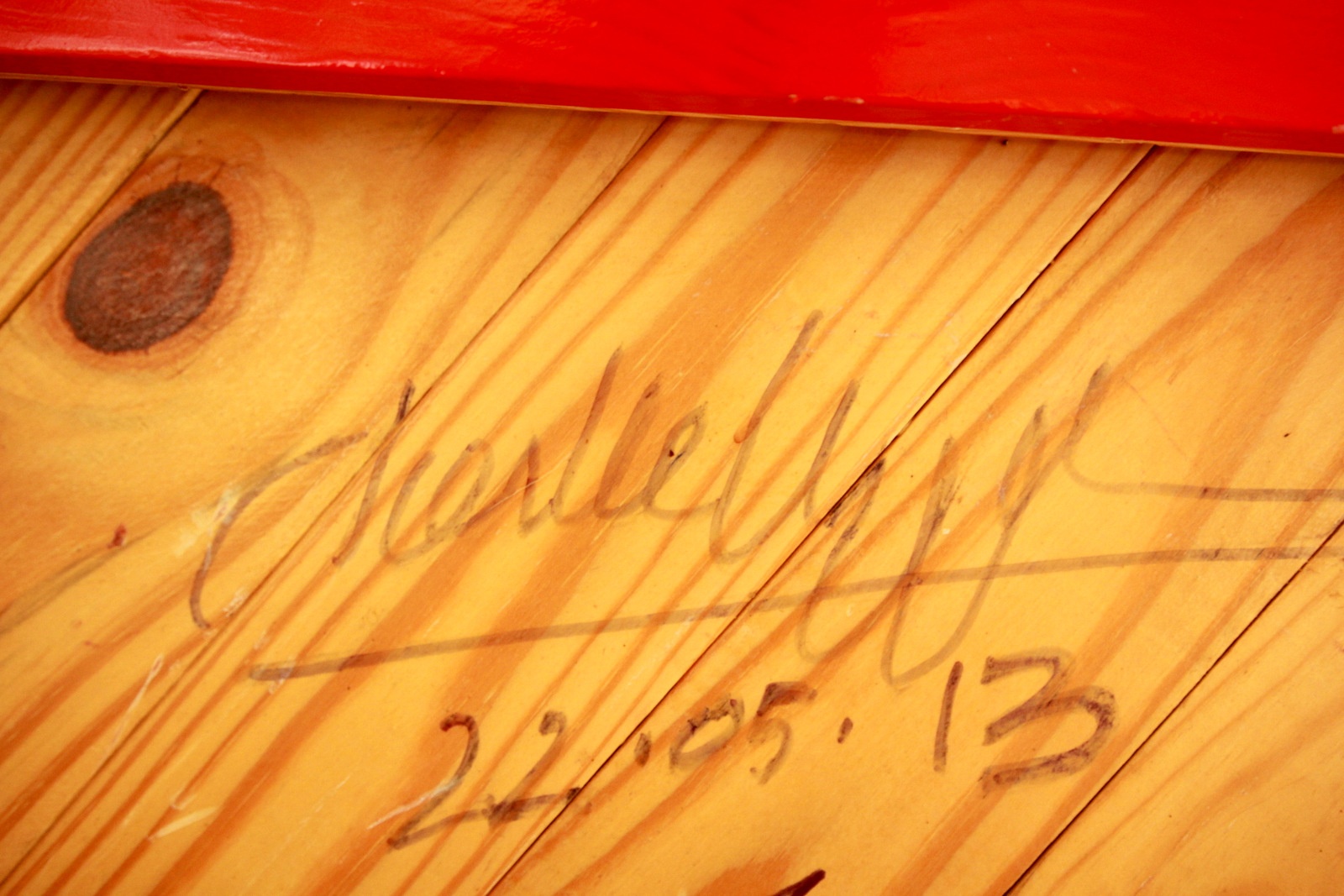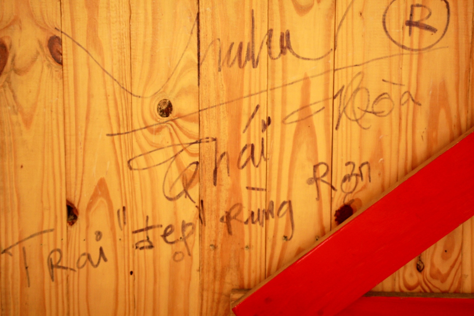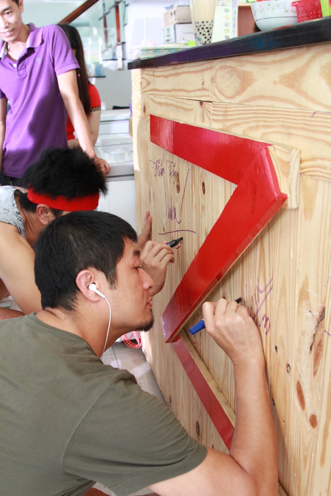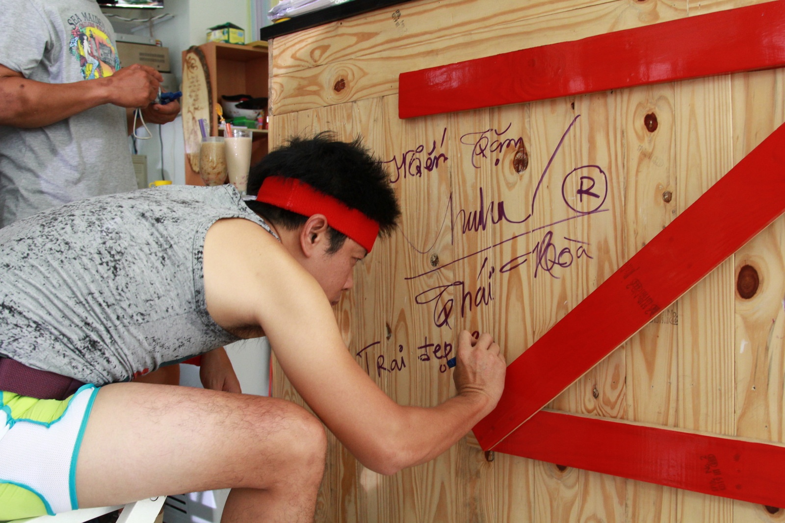 Thái Hòa cùng đạo diễn Charlie Nguyễn và cả ê-kíp còn trân trọng ký tặng lên vách tủ của một địa điểm họ mượn ghi hình.