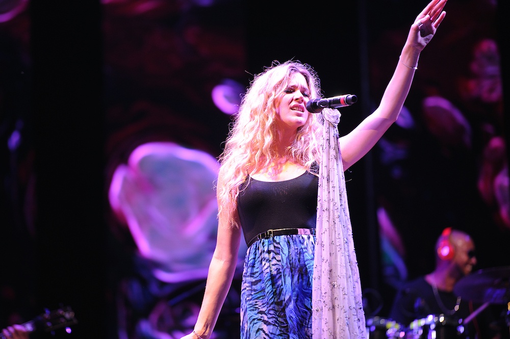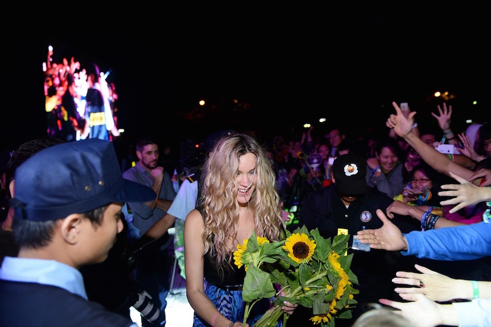 | Kết thúc phần trình diễn vào nửa đêm, nữ ca sĩ mang một bó hoa hướng dương lớn xuống tặng khán giả Hà Nội như một thông điệp đẹp về tình yêu và nghệ thuật. |