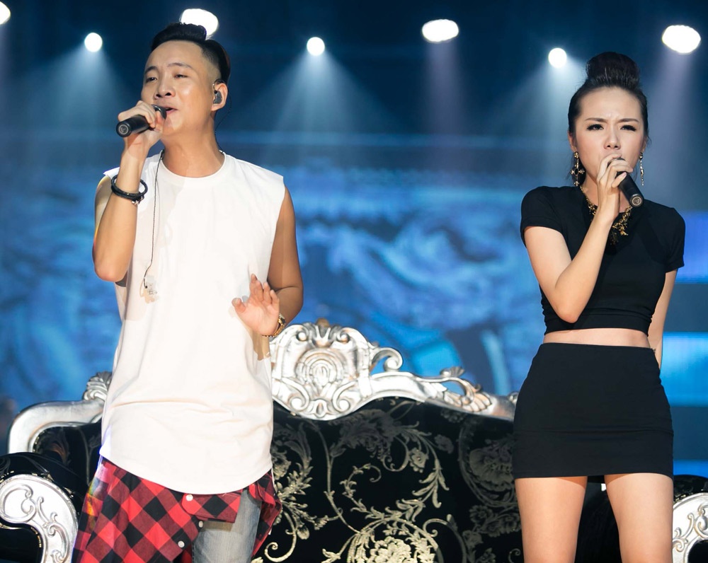 | Trong liveshow, nữ ca sĩ xinh đẹp Phương Ly song ca cùng Justatee ca khúc Người nào đó. Em gái Phương Linh diện bộ đồ đen, ôm sát cơ thể và tự tin khoe giọng hát bên cạnh nam ca sĩ. |