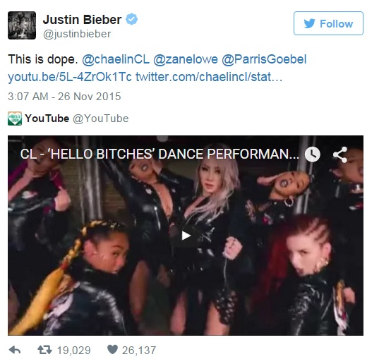 Ngày 26/11, Justin Bieber cũng thể hiện sự ủng hộ với nữ ca sĩ người Hàn Quốc khi chia sẻ MV Hello bitches trên trang mạng xã hội cá nhân cùng lời bình luận "Thật tuyệt vời".