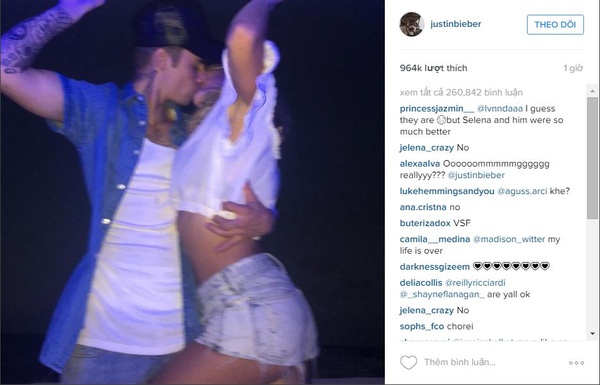 | Mới đây giọng ca Baby còn công khai đăng ảnh khóa môi chân dài Hailey Baldwin trên Instagram cá nhân. |