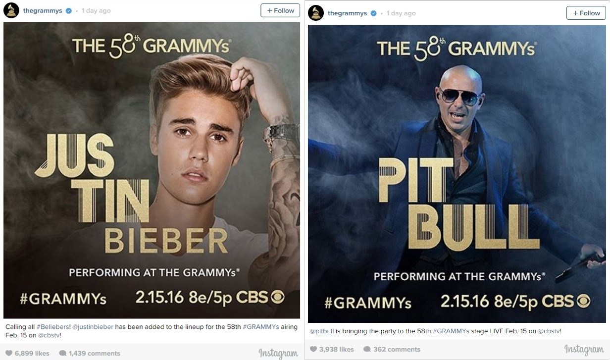 | Poster xác nhận sự góp mặt của Justin Bieber và Pit Bull trên trang Twitter chính thức của Grammy 2016 nhận được hàng ngàn lượt yêu thích của người hâm mộ. |
