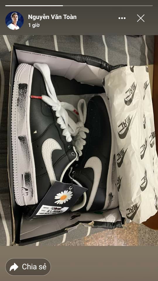 Ngay khi nhận được đôi giày hoa cúc, Văn Toàn lập tức chia sẻ hình ảnh lên trang cá nhân với tâm trạng vui vẻ. Thực tế, chân sút người Hải Dương là fan cứng của Big Bang, anh từng cảm thấy buồn khi G-Dragon đi nhập ngũ. Ảnh: FBNV.