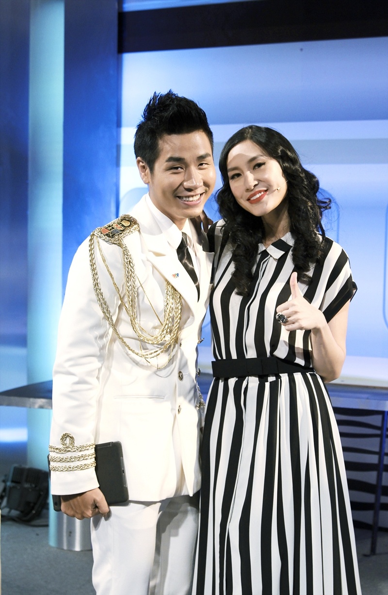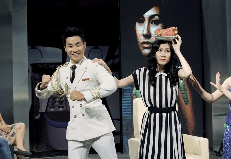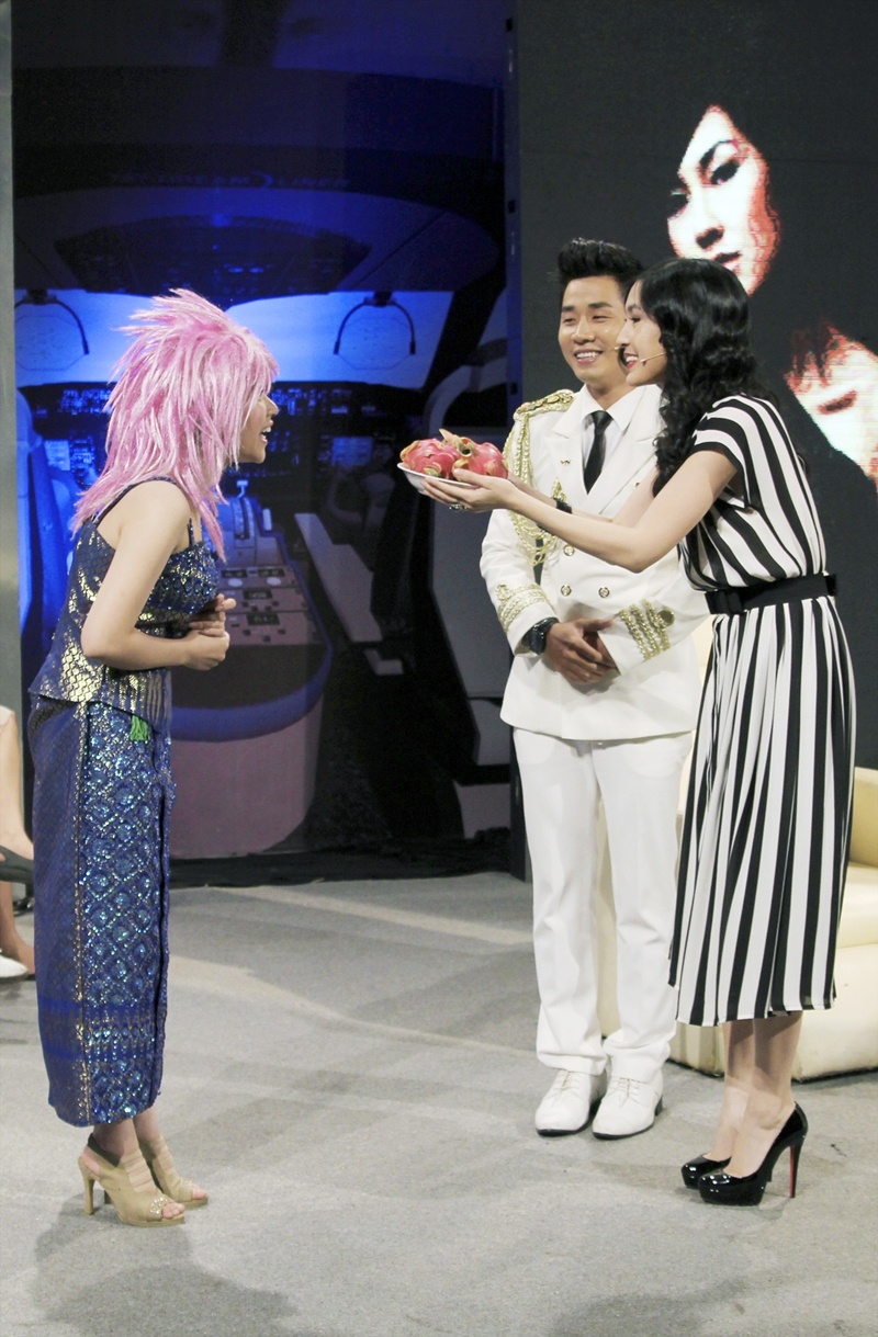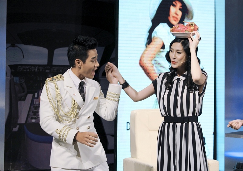 | Kathy Uyên duyên dáng với dĩa thanh long trên đầu, phối hợp nhịp nhàng và ăn ý cùng Nguyên Khang |