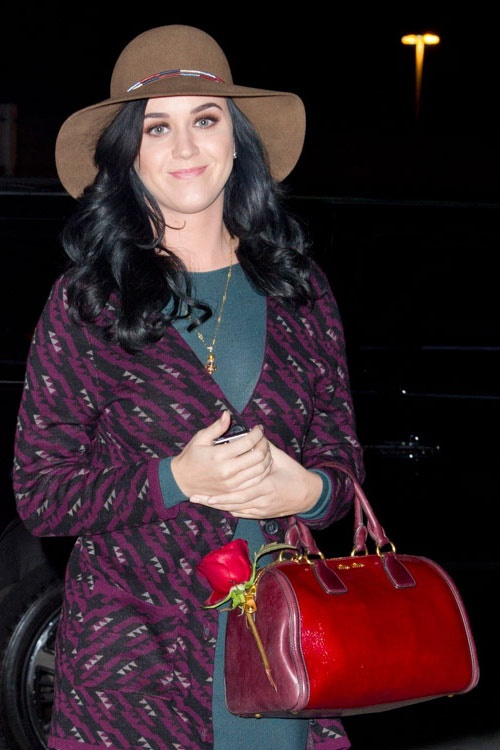 | Katy sang trọng với mẫu túi xách nạm đinh tinh tế của Prada. |