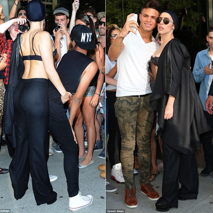 | Tuy nhiên, đó chỉ là trên thảm đỏ. Ngay trước khi tham dự MTV VMA, Lady Gaga đã gây sốc khi ra phố New York với thời trang "một mất một còn" và khoe trọn phần trên cơ thể. |