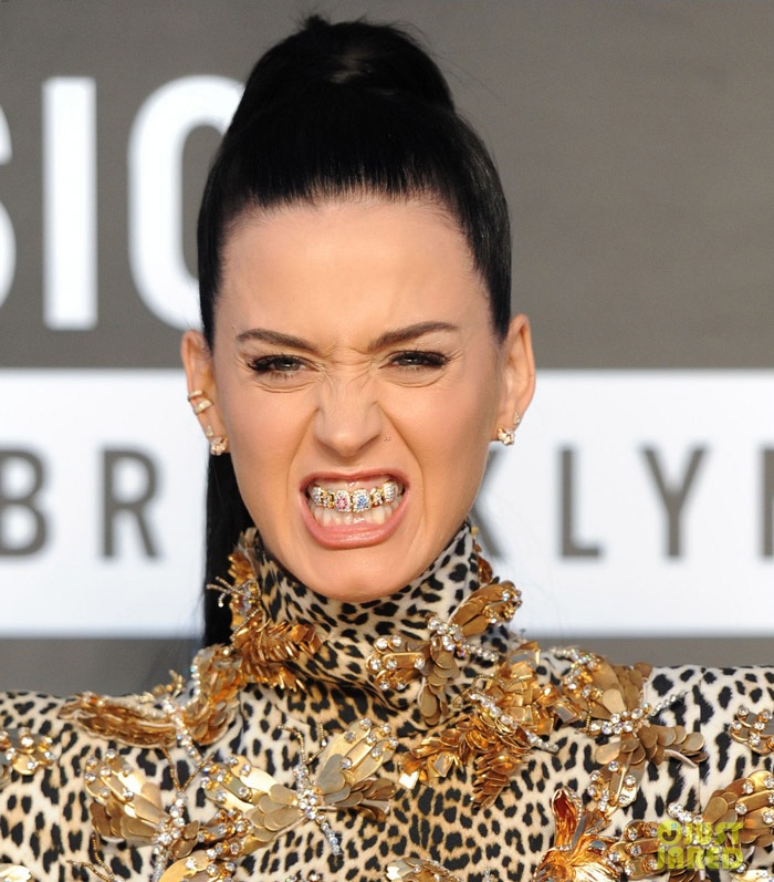 | Vừa tung ra album Roar (tạm dịch: Gầm rú), Katy Perry đã tận dụng ngay cơ hội xuất hiện trên thảm đỏ MTV VMA để quảng bá theo cách có "một không hai". Chuẩn bị sẵn một hàm răng đính pha lê lóng lánh, cô ca sĩ 28 tuổi không ngại "gầm rú" ngay trước ống kính phóng viên. |
