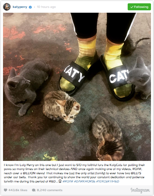 | Katy chia sẻ tin mừng với fan qua bức ảnh những chú mèo. |