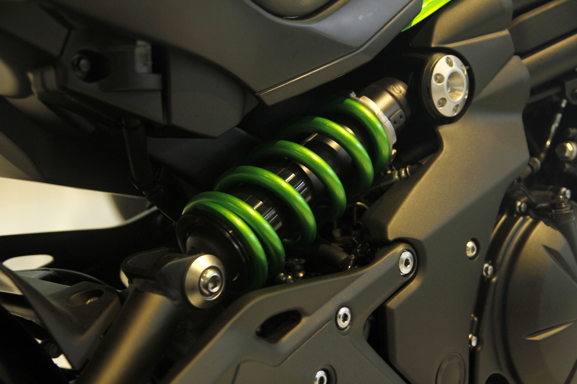 | Giảm xóc dạng monoshok được đặt lộ phía phải sườn xe, có khoảng nhún 130 mm, kết hợp với gắp đôi đa liên kết. Cùng với Z1000 và Z800, ER-6n được xem là mẫu xe giá rẻ, phù hợp với những người mới bắt đầu chơi xe và chưa đủ điều kiện sở hữu hai mẫu xe trên nhưng yêu thích thương hiệu Kawasaki. |