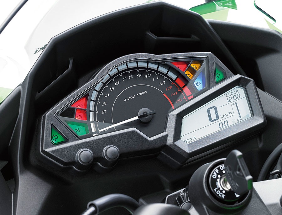 Cụm đồng hồ được chỉnh sửa lại, giúp người điều khiển dễ quan sát hơn trong điều kiện thiếu sáng. Trong khi đó, ở điều kiện vận hành ban ngày, màu sắc mới mang đến sự cá tinh hơn cho mẫu sportbike 250 phân khối này. |