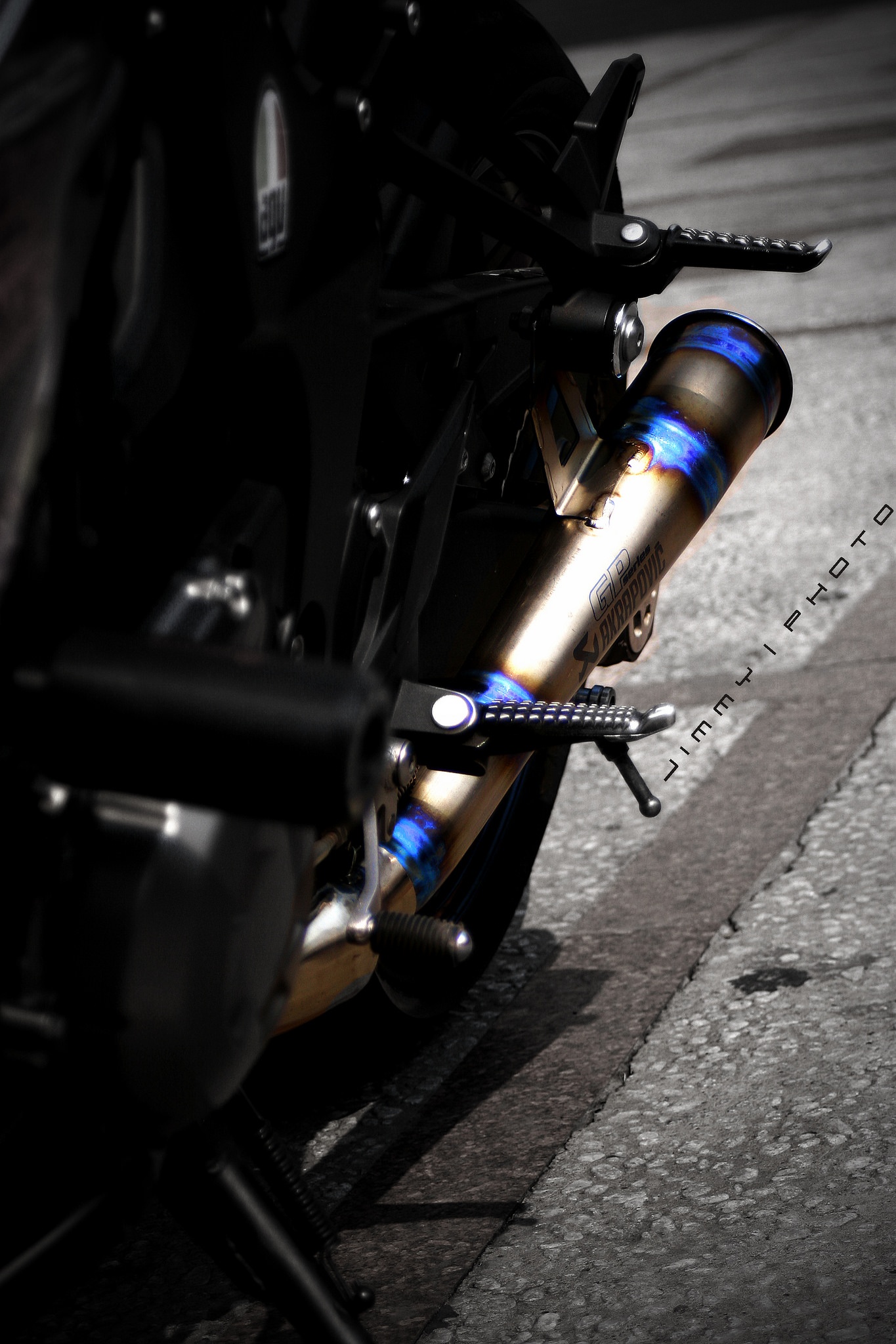 | Xe được lắp pô đôi Akrapovic Titanium MotoGP với bốn cổ pô được ghép lại thành một họng xả. |