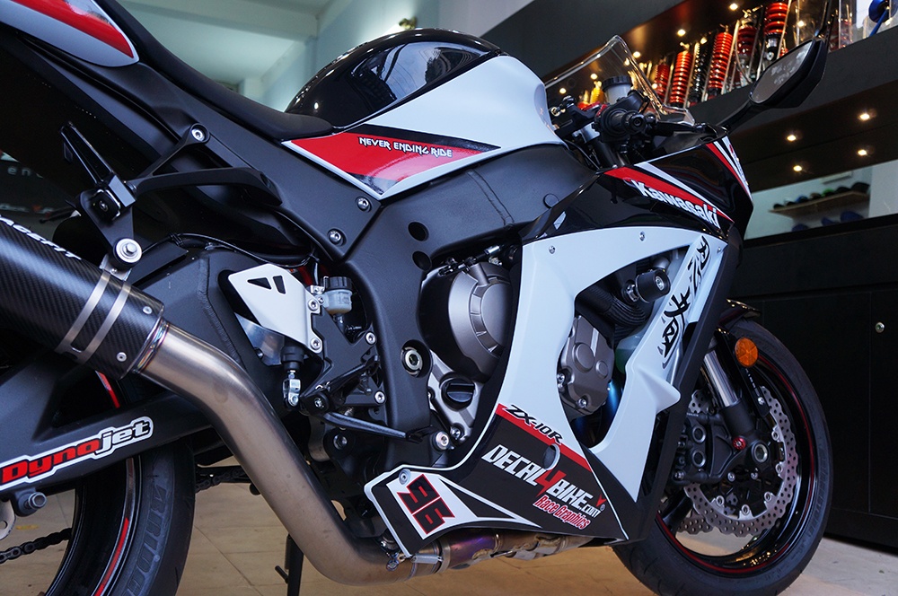 Thiết kế và kiểu dáng vốn có của ZX-10R đã đủ độ hầm hố, bắt mắt, tuy nhiên chủ nhân của chiếc xe tại Sài Gòn còn muốn nhiều hơn thế, khi cá tính hóa chiếc xe không chỉ ở các món đồ chơi đi kèm, mà còn cả ở bộ tem xe.