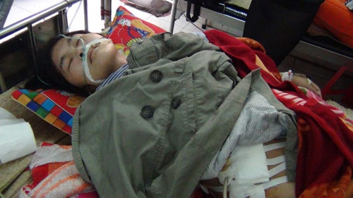 | Chị Chuyên nằm viện khi bị chồng dùng dao đâm trọng thương. |