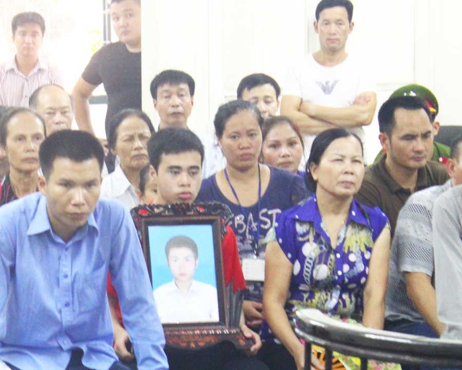 | Người nhà nạn nhân ôm di ảnh tại tòa. |