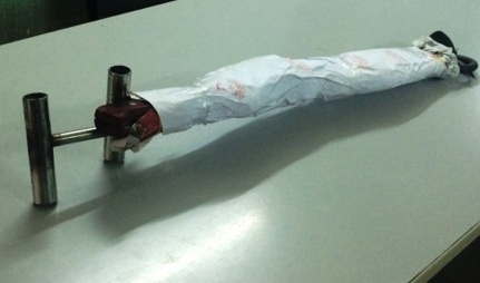 | Hung khí chúng dùng để kề vào cổ chủ quán đòi bồi thường tiền viện phí. |