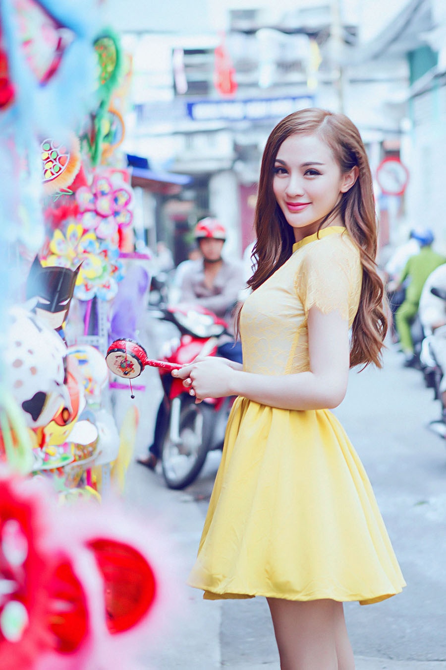 | Đầm cocktail cũng được hot girl ứng dụng khi thể hiện khung ảnh mới mẻ, đậm sắc màu truyền thống. |