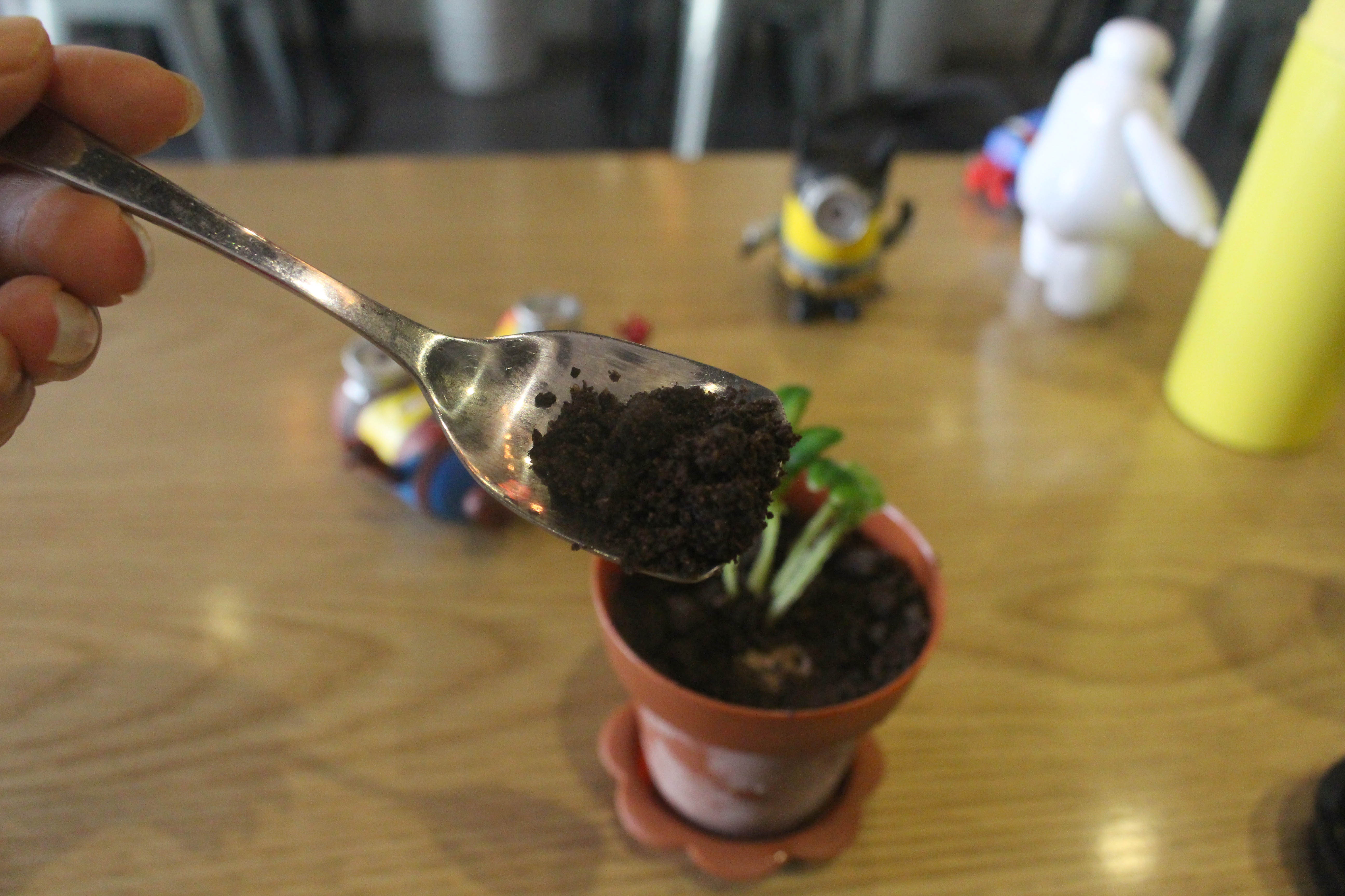 Nếu ở nơi đầu tiên giới thiệu, kem chỉ được múc, trang trí "đất" (bánh oreo xay nhuyễn) bên trên khiến món kem rời rạc, thì tại quán, các phần này có sự kết dính nhất định.