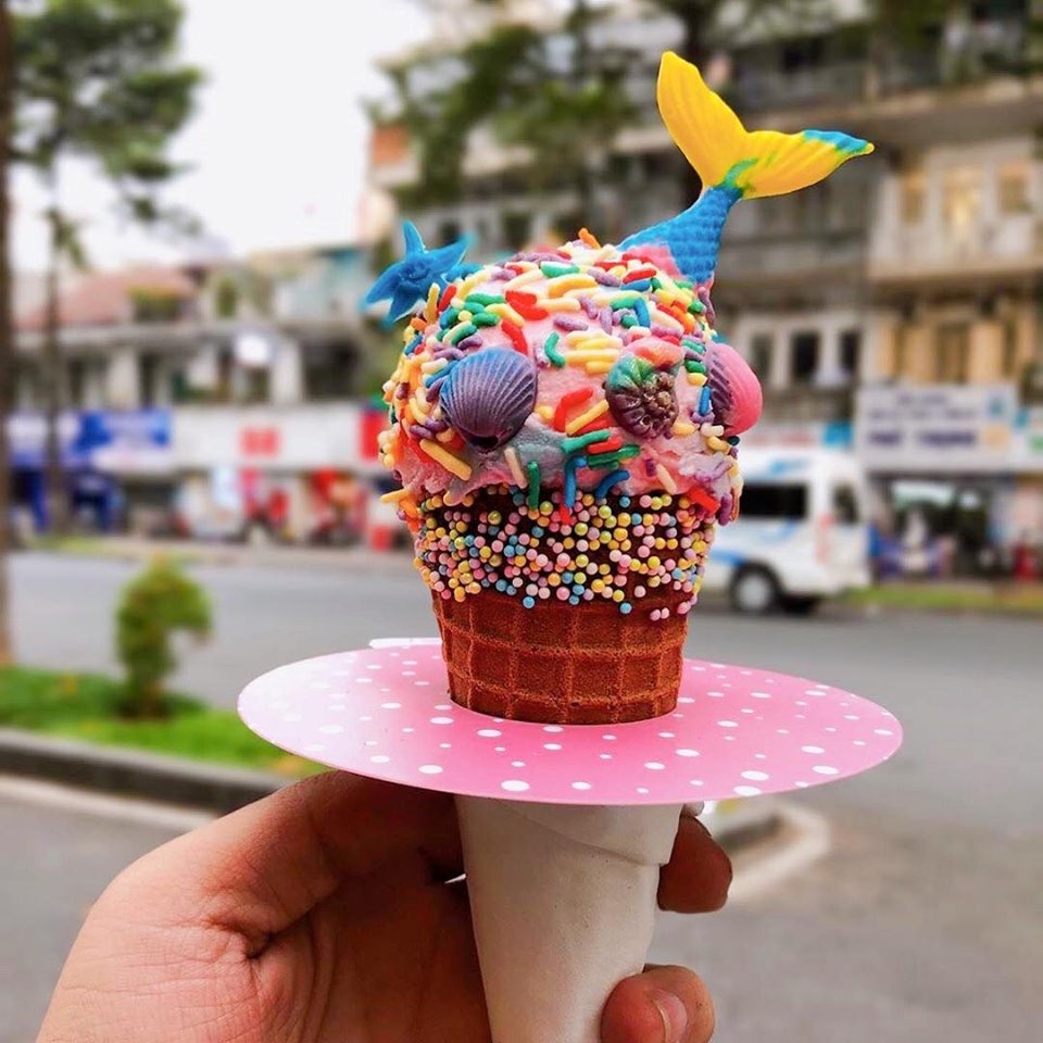 Kem nàng tiên cá: Nàng tiên cá là tên một loại kem độc đáo của tiệm kem nằm giữa trung tâm TP.HCM. Kem được quán tạo hình tựa một nàng tiên cá quyến rũ giữa ốc đảo miền nhiệt đới. Bên ngoài lớp kem thơm ngon, béo ngậy là lớp cốm phủ đầy màu sắc. Ảnh: Canquetsaigon. |