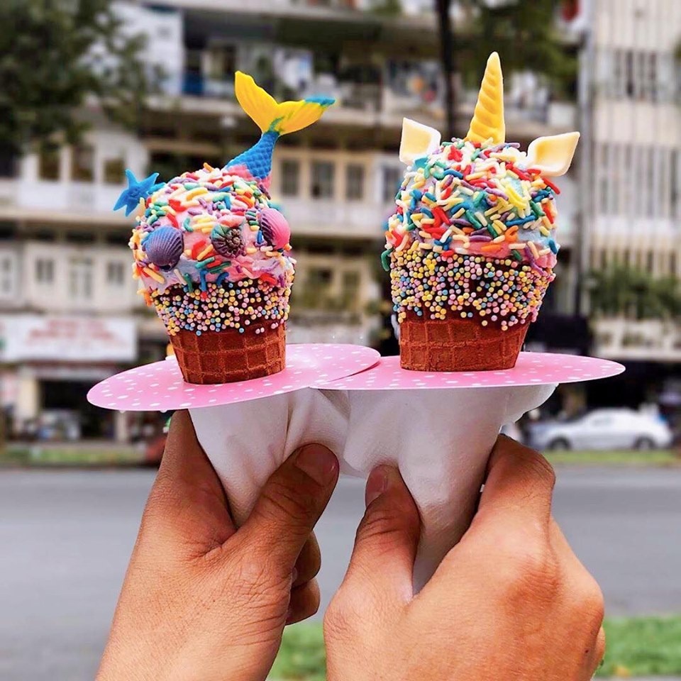 | Bảo Bảo, một thực khách từng thưởng thức, chia sẻ: "Kem có vị khá giống kẹo cao su và không quá ngọt. Mình ấn tượng bởi kem được tạo hình tại chỗ nhìn rất chuyên nghiệp". Bên cạnh hình nàng tiên cá, quán còn nổi tiếng với kem tỉa hình hoa hồng và Unicorn lạ mắt. Ảnh: Hoanglam.foodie, Canquetsaigon. |