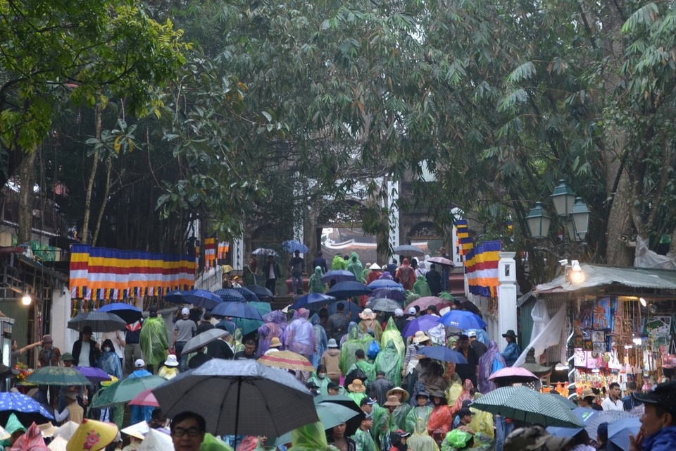 | Du khách đội mưa đổ về khai hội chùa Hương sáng 22/2. Ảnh: BTC. |