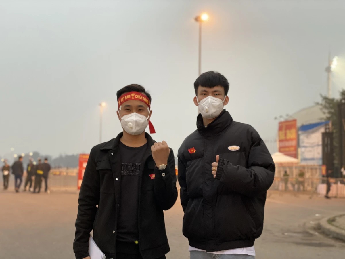 Đến SVĐ Mỹ Đình (Hà Nội) từ 16h30, Văn Tam và Đình Phúc tranh thủ chụp ảnh check-in trước khi qua cửa soát vé, tiến vào xem trận đấu giữa tuyển Việt Nam và Saudi Arabia diễn ra lúc 19h.