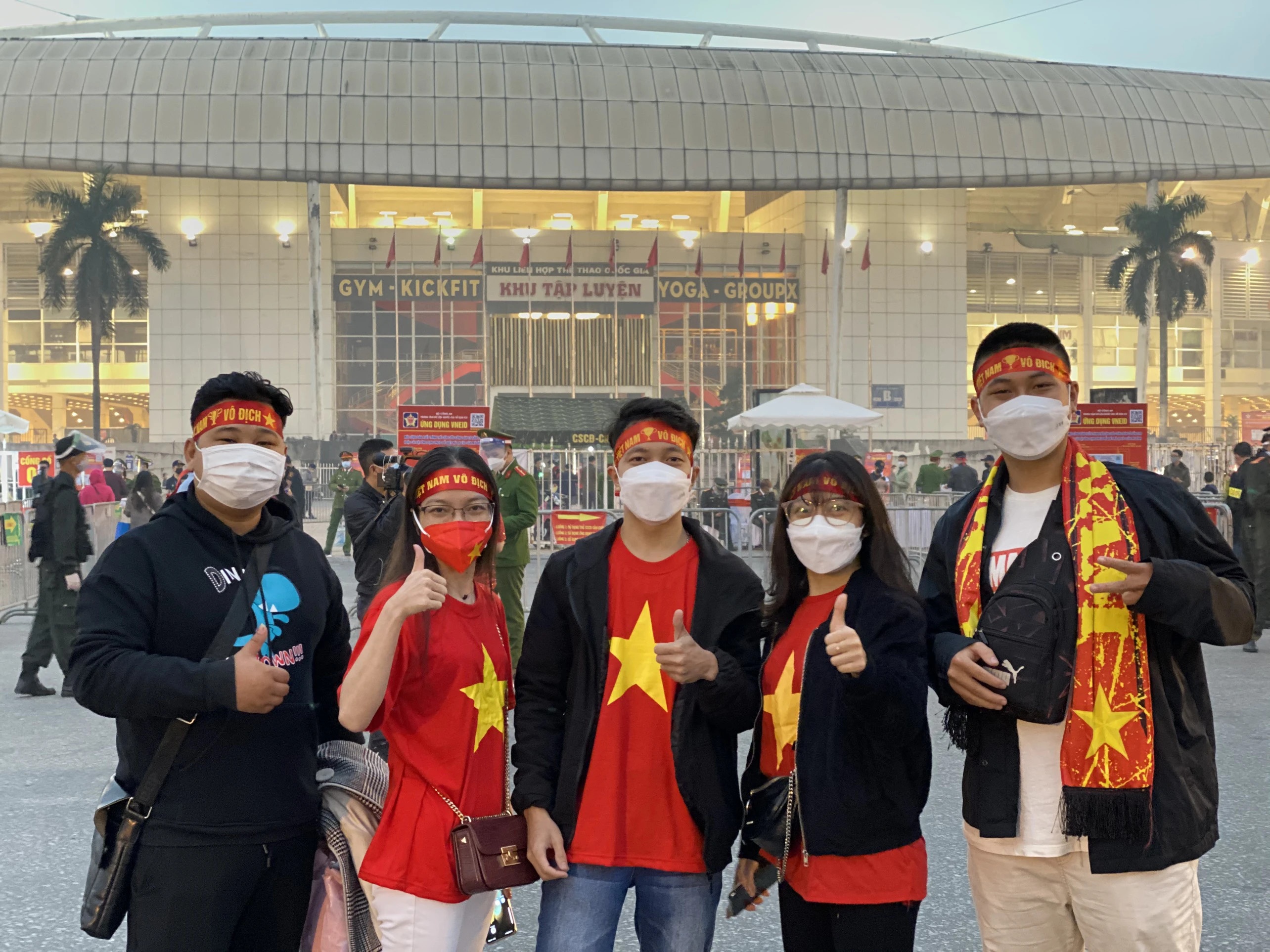 Để sớm đến sân ổn định chỗ ngồi và tận hưởng không khí nhộn nhịp bên ngoài sân vận động, nhóm bạn đã xin nghỉ làm sớm và có mặt vào khoảng 17h15. Vốn là những người thường xuyên đến sân cổ vũ tuyển Việt Nam, nhóm bạn đã chuẩn bị sẵn áo cờ đỏ sao vàng, băng rôn cổ vũ từ nhà.