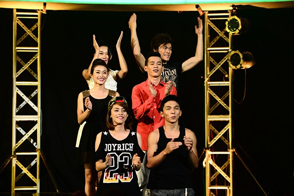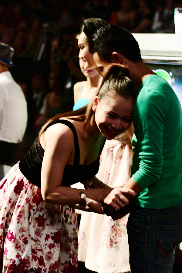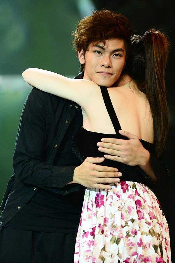 Các thí sinh khác chạy òa lên sân khấu để ôm Đình Hải và Ngọc Tiên. |