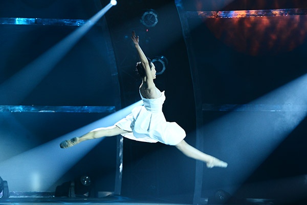Minh Tú như một cô thiên nga trắng đang chơi đùa, với những bước chân ballet đầy kỹ thuật, lướt đi nhẹ nhàng hạnh phúc trong giai điệu của bài Joy. |