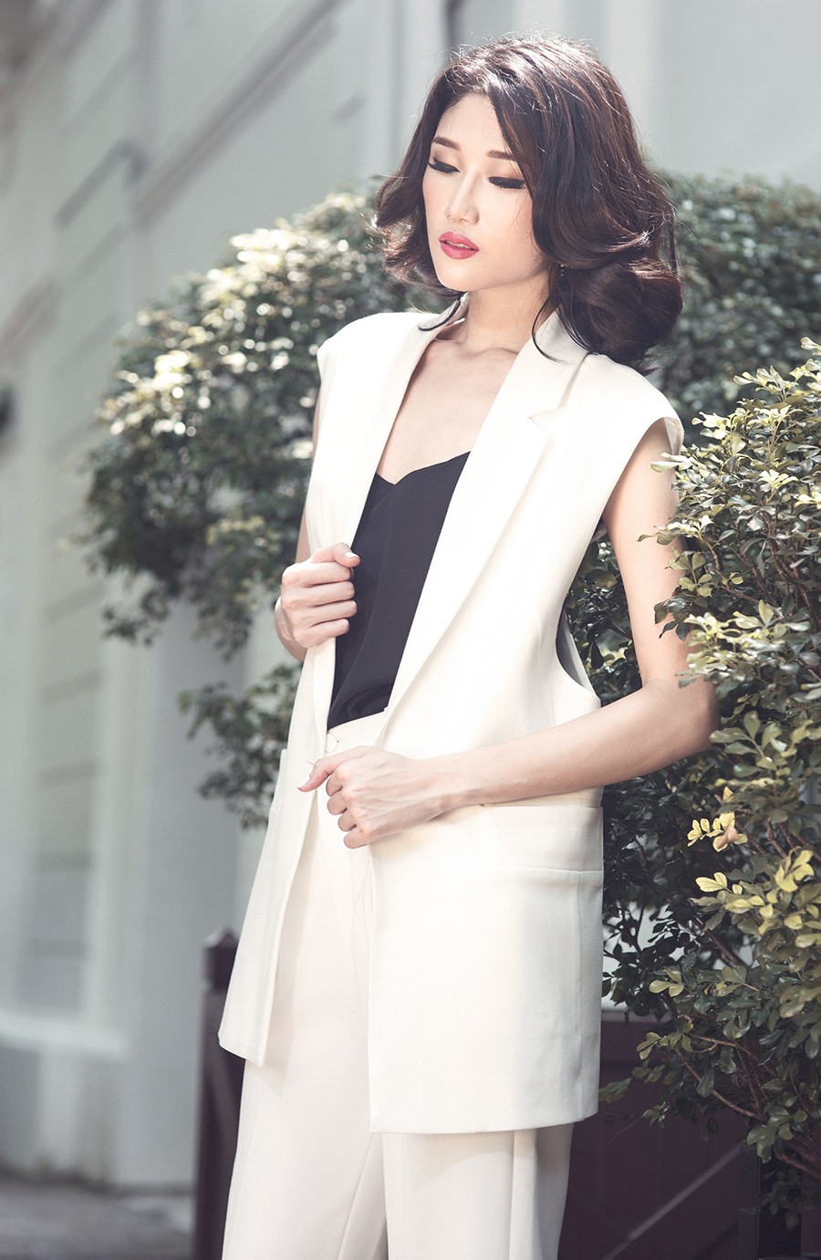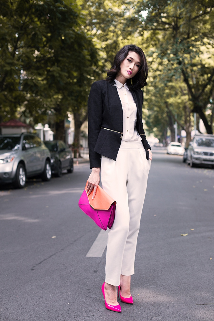 | Set trang phục mang đến vẻ thanh lịch nhờ gam màu đen trắng, bộ vest tối màu phối hài hòa cùng áo sơ-mi voan mỏng cài cúc cao hợp xu hướng. |