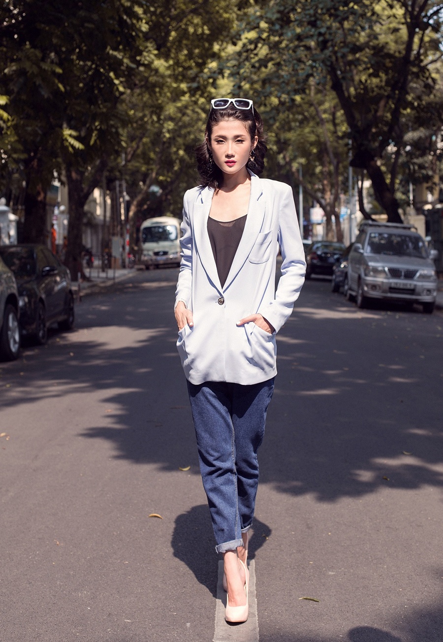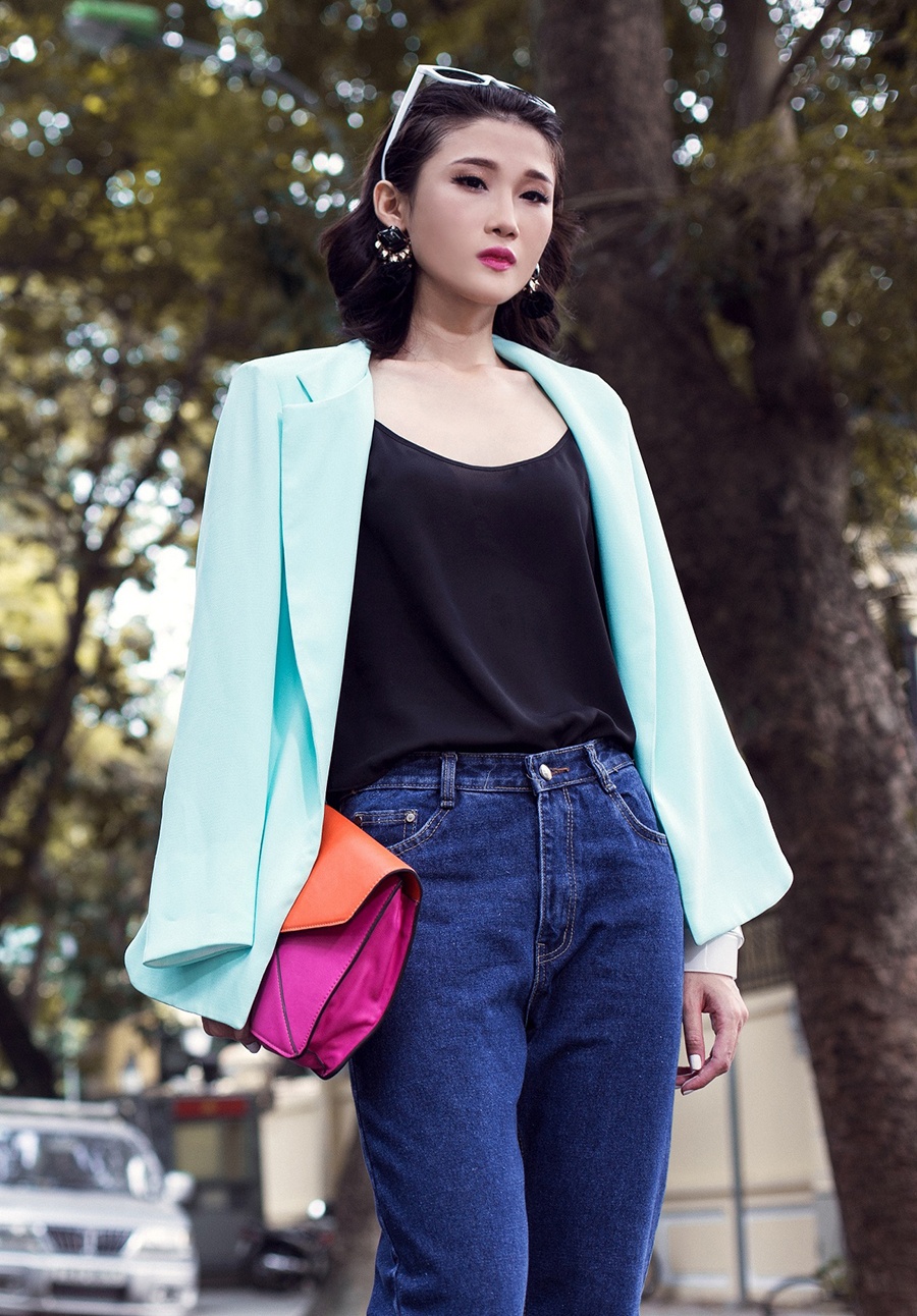 | Áo blazer tông màu pastel mang lại hình ảnh sang trọng và không kém phần lịch thiệp khi mix cùng quần jeans, áo voan mỏng. |