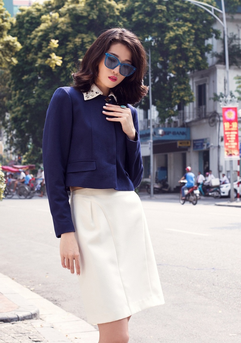 | Áo blazer lửng mix khá cổ điển cùng chân váy lửng. Tông màu xanh trắng phối hiện đại. |
