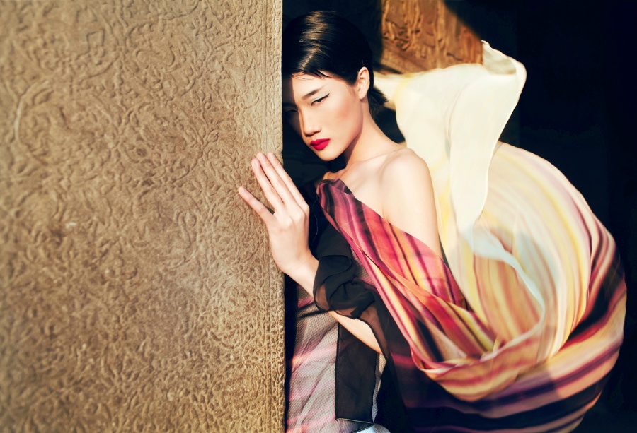 Trên nền bối cảnh truyền thống, người đẹp đến từ Việt Nam nổi bật với thân hình mảnh mai và trang phục bay bổng, phóng khoáng.