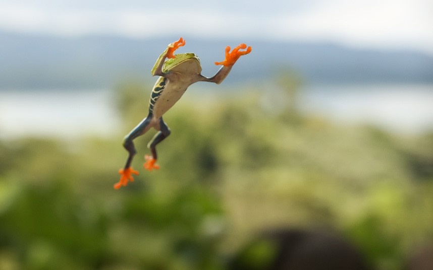 Ếch cây mắt đỏ phi thân lên không trung trong rừng mưa nhiệt đới Trung Mỹ. Loài sinh vật nhỏ bé này có thể nhảy xa tới 1,5 m trong mỗi lần di chuyển. Ảnh: Barcroft. |