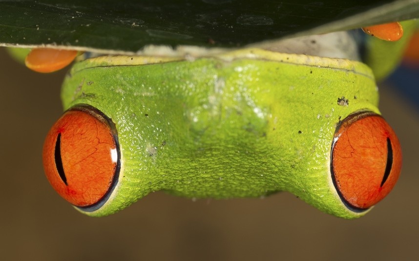 Giống như tên gọi, ếch cây mắt đỏ có cặp mắt màu đỏ rực với con ngươi hình bầu dục hẹp. Chúng săn mồi vào ban đêm và nằm bất động ban ngày để tránh kẻ thù. Ảnh: Barcroft. |