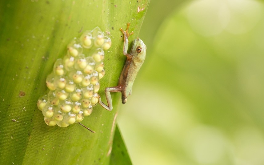 Trong mùa giao phối, ếch đực thường xuyên di chuyển giữa các tán lá rừng để tìm ếch cái. Khi phát hiện ra đối phương, chúng liên tục rung nhánh cây đang ngồi để thu hút bạn tình. Sau khi giao phối, con cái chọn chiếc lá trên một cái ao hoặc vũng nước để đẻ trứng. Ảnh: Barcroft. |